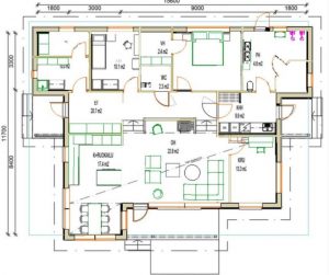 Kolmantena vaihtoehtoihimme löytyi Jetta talon Oodi110. Talon koko oli löytämiimme tontteihin sopivan kokoinen, sekä ulkonäöllisesti todella ihana. En löytänyt tähän kuvaa omasta pohjapiirustuksesta. Talon pohja oli aika haastava suunnitella toiveiden mukaiseksi, mutta sain siitäkin pyörittämällä kohtalaisen. Hylkäsimme kuitenkin tämänkin vaihtoehdon, koska totesimme sen olevan liian pieni. Halusimme enemmän kuin kaksi makuuhuonetta.